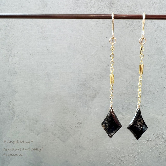 【仕様】 ♦素 材:スキャポライト、14KGF ♦サイズ:約5.2cm(ピアス金具含まず) ♦その他:イヤリングパーツ交換可能(オプション選択あり) 【商品説明】 「影のかたち」___黒くぼんやりと、光の下に揺れる影。その奥で鈍く光がゆらめく。触れるたび、見るたびに表情を変える石は、目に見えない何かをそっと想起させる。 【天然石からのメッセージ】 依存心を取り除く、判断力、人生の羅針盤、インスピレーション