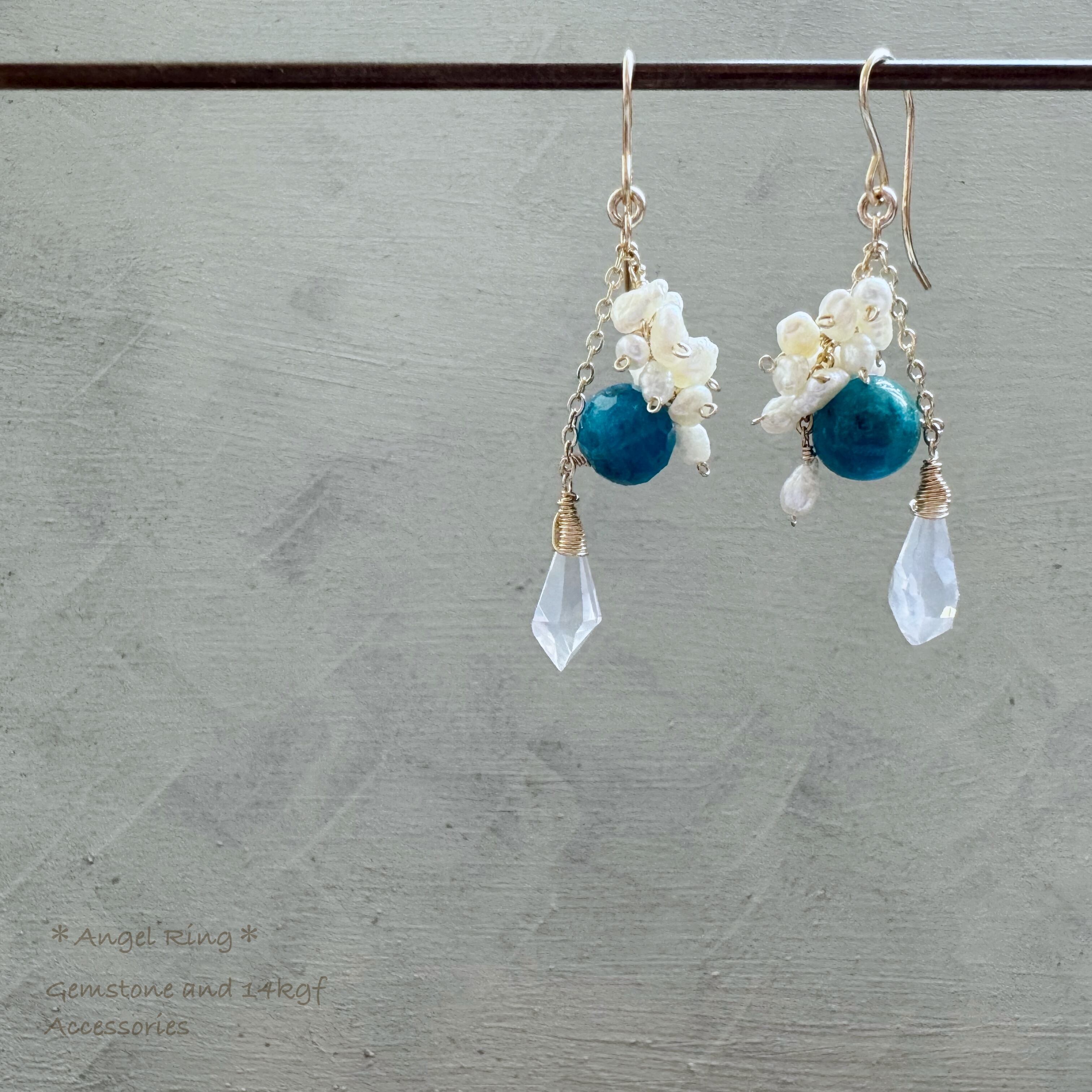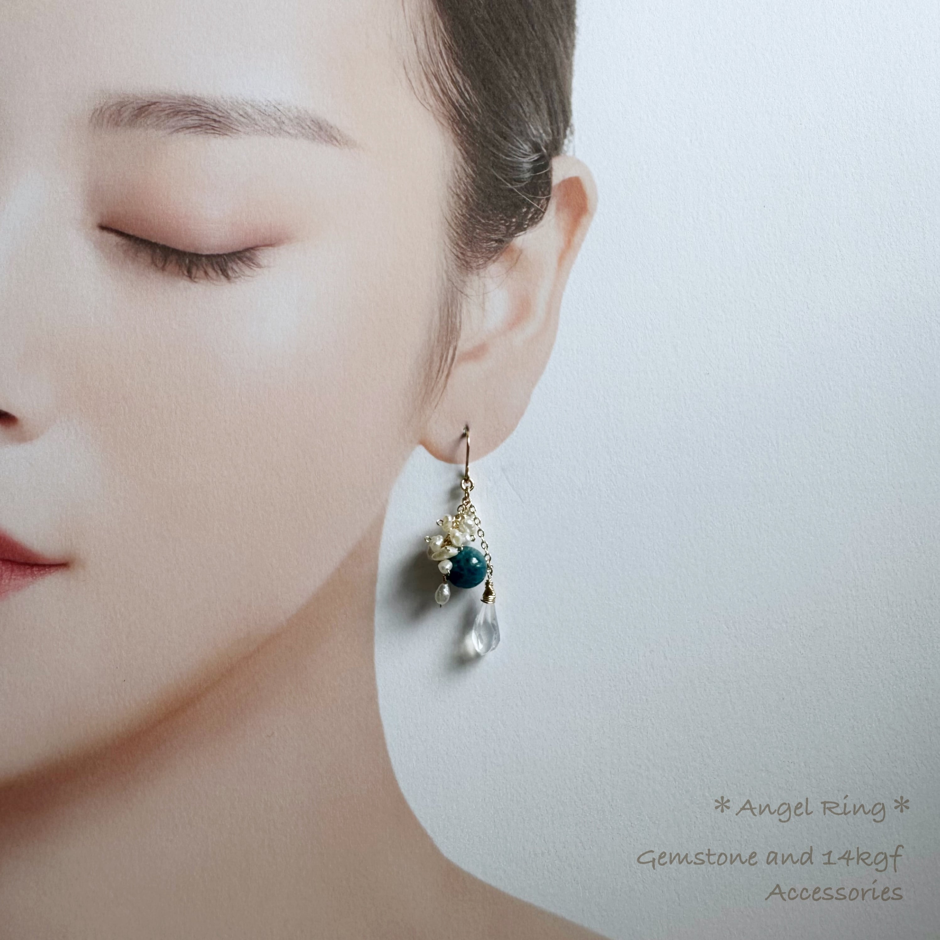 「深海月雫」___異世界をまとうような特別な世界観を耳元に。海の底に迷い込んだような、静かで幻想的な世界。アパタイトの深い海の色とムーンクォーツの月光が出会い、淡水パールが深い輝きを添えます。