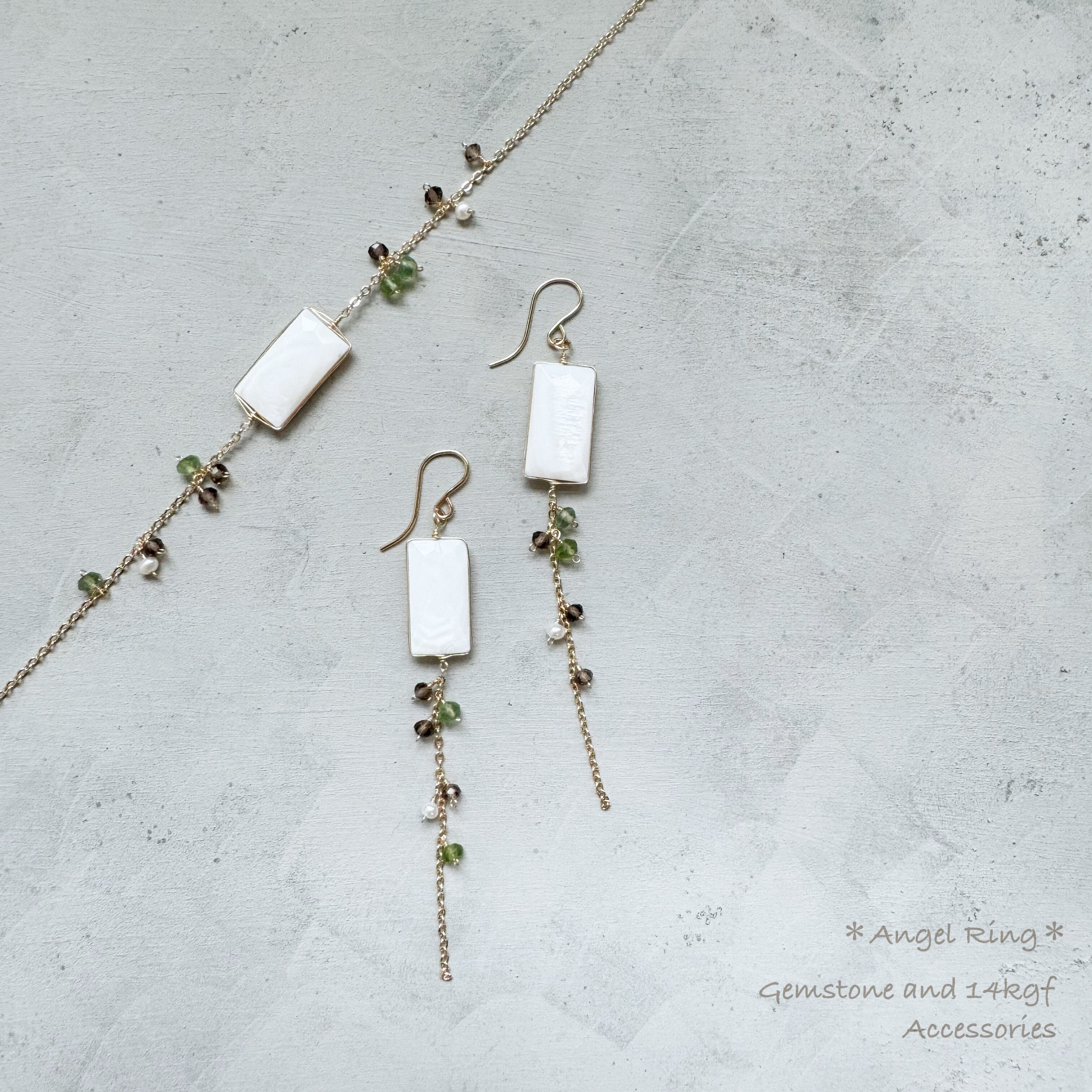 「Autumn Wedding ~森の中のガーデンパーティ~」___風が少し涼しくなり始めた初秋。 木々に囲まれた静かな森で、ひっそり開かれるガーデンパーティ。 自然と調和する華やかさを纏ったアクセサリーは、白蝶貝の上品な艶めきに、 落ち着いた色味のサーペンティンやスモーキークォーツが寄り添い、 淡水パールがさりげない気品を添えます。 特別な日の装いに自然と寄り添うアクセサリーです。